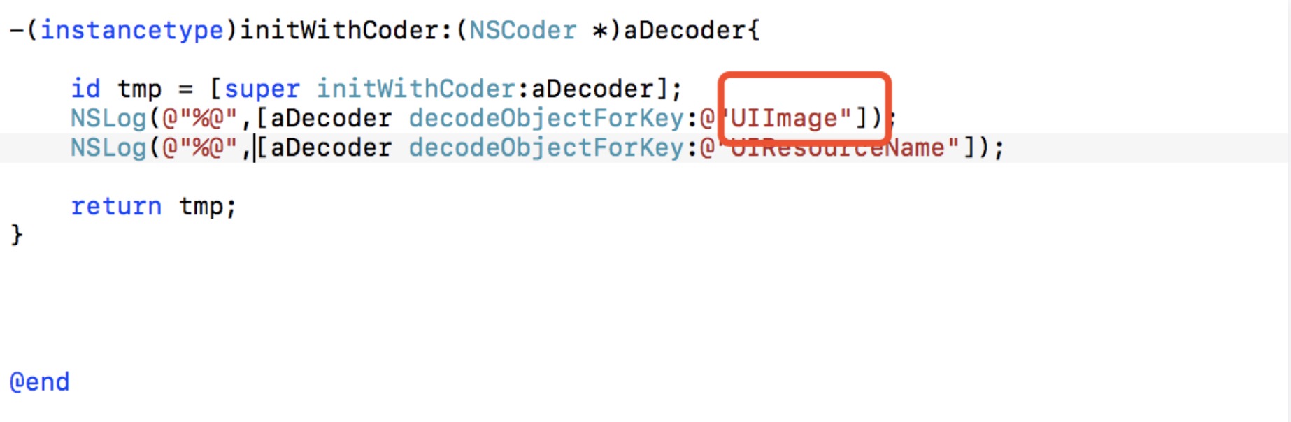 - 打印系统 decode 的所有 key 后发现有个 key 为 UIResourceName,value 为图片的名称,也就是说能得到 Xib 上设置的图片名称。但是这个图片的名称怎么传递给这个 Xib 对应的 UIImageView 对象呢?换句话说我们怎么把图片传给这个 Xib 对应的 view 呢?为了将图片名称传给 UIImageView,需要给 aDecoder 添加一个 block 的关联引用: