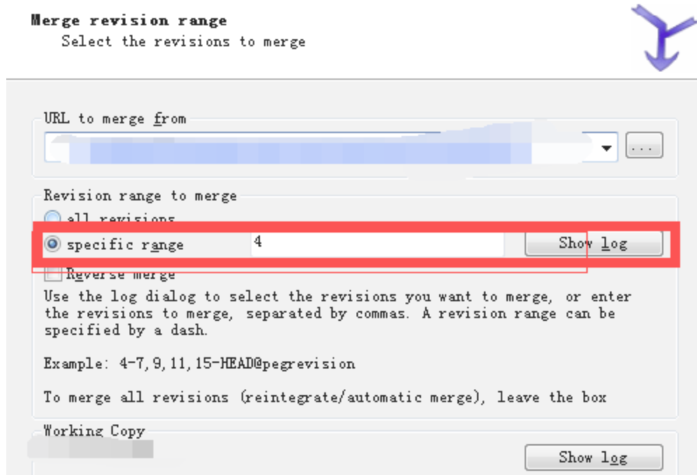 点击next 在URL to merge from 选择要合并得分支 ,Revisions range to merge :选择specifie range 选择需要合并得版本
