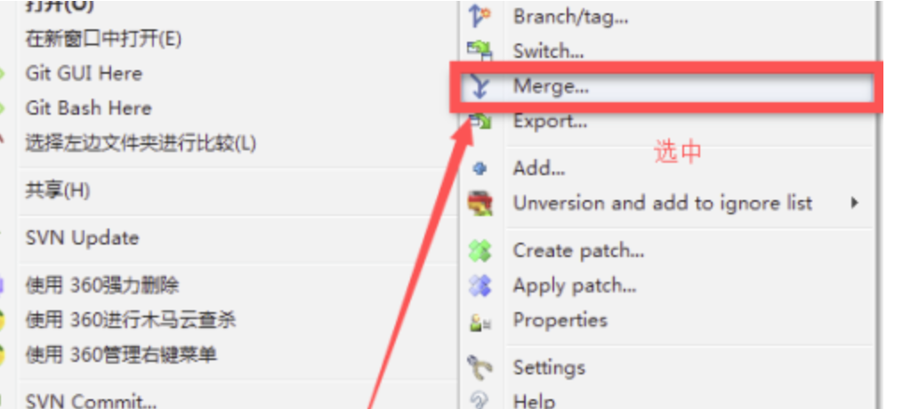 合并分支(在主干 右键选择-> tortoisesvn ->Merge),具体操作如下图所示: