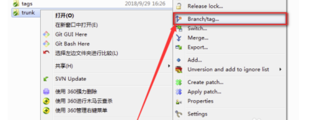 在主分支上创建文件结构并提交到SVN版本控制器上,选中trunk文件夹选中SVN选项:操作如下图所示: