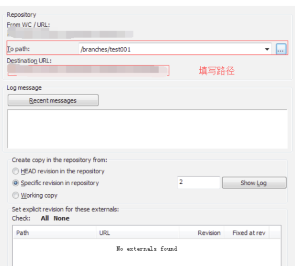 编辑对话框中的to path 选项 (To path 选择分支路径)如下图所示:填写SVN路径地址:可以手动输入路径也可以浏览文件选中地址: