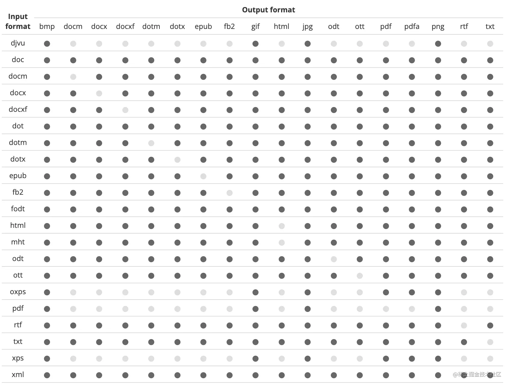 下面是文本文档文件格式可以转换成其他格式的列表,第一列是源格式,从第二列到最后一列是可以转换成的其他格式,其中深色圆点表示支持,浅色圆点表示不支持。
