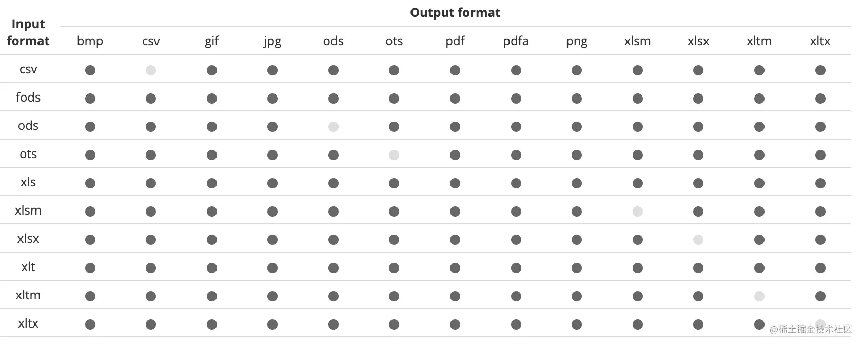下面是电子表格文件格式可以转换成其他格式的列表,第一列是源格式,从第二列到最后一列是可以转换成的其他格式,其中深色圆点表示支持,浅色圆点表示不支持。