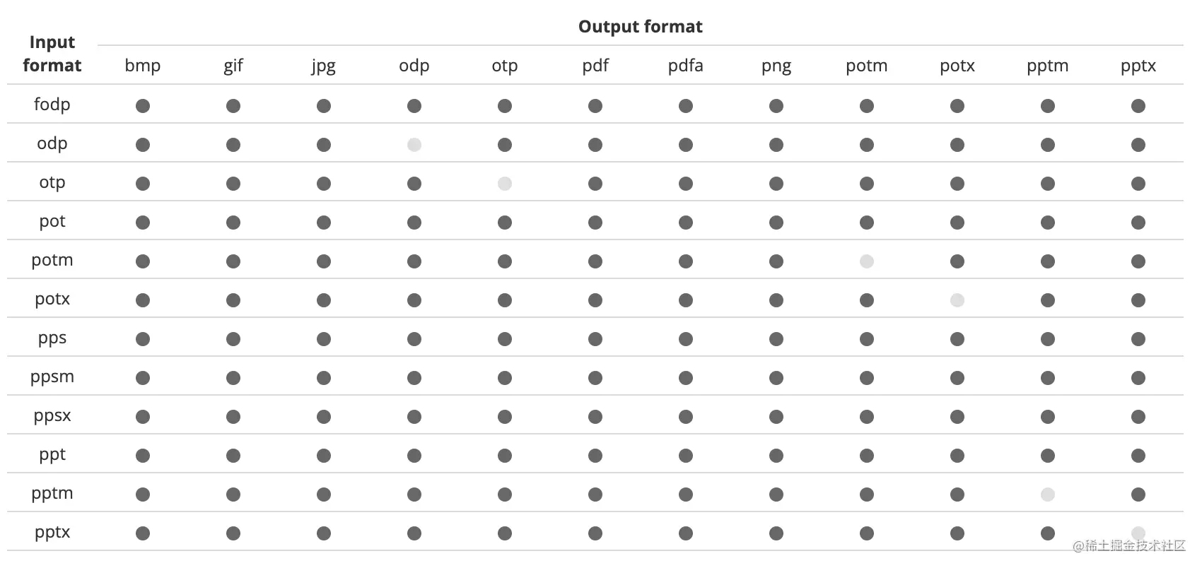 下面是演示文稿格式可以转换成其他格式的列表,第一列是源格式,从第二列到最后一列是可以转换成的其他格式,其中深色圆点表示支持,浅色圆点表示不支持。