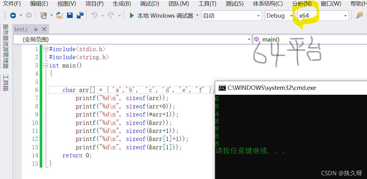 前面我们已经提到了sizeof在整形数组的使用,因为strlen只能在字符数组中使用,所以上一