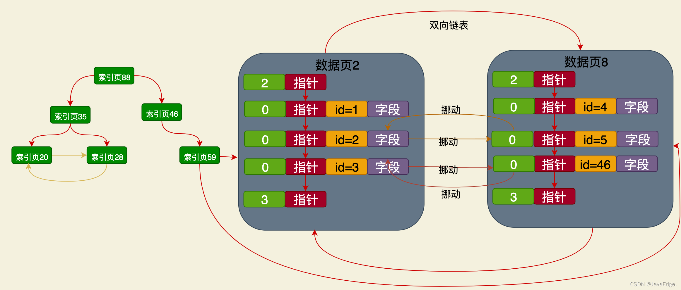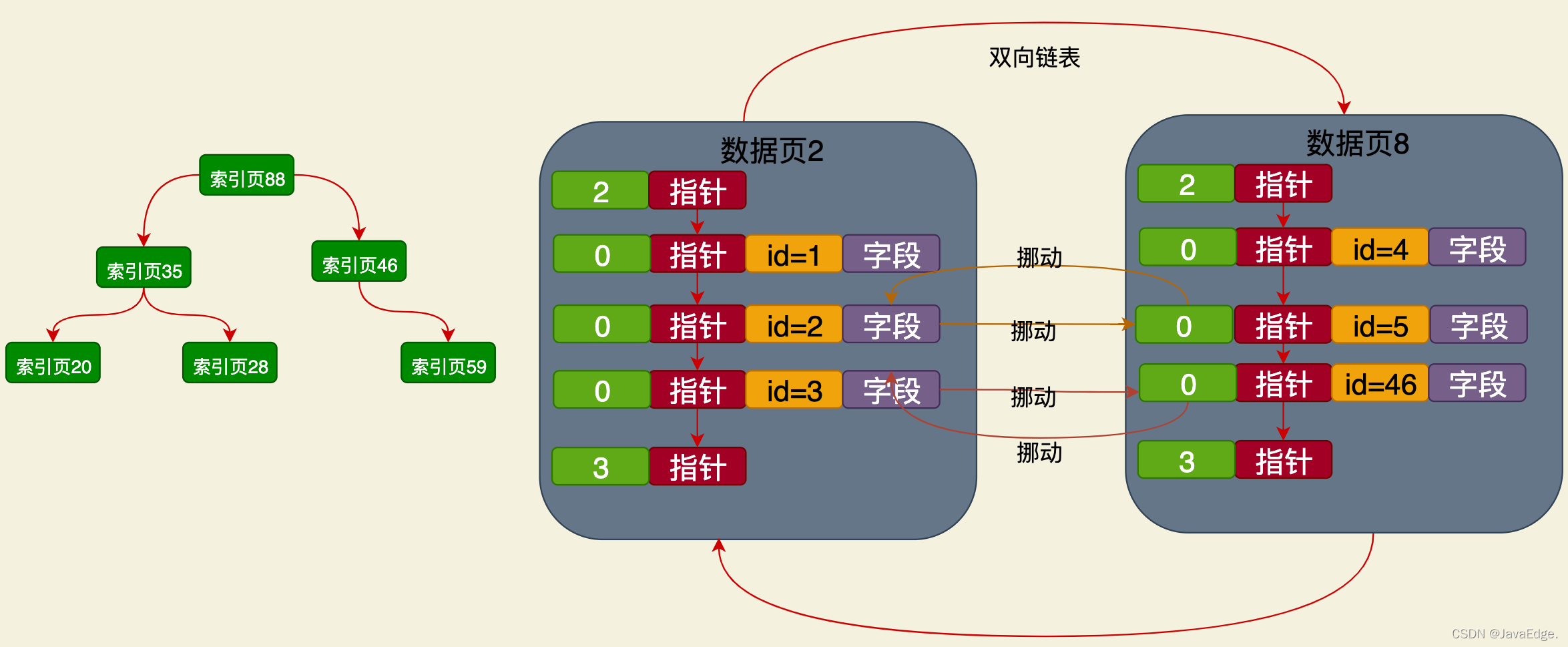 最下层的索引页,都有指针引用数据页,所以索引页之间跟数据页之间有指针连接。索引页内部,同一层级的索引页互相之间也是基于指针组成双向链表: