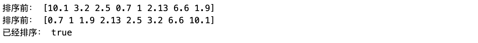 排序前: [10.1 3.2 2.5 0.7 1 2.13 6.6 1.9] 排序后: [0.7 1 1.9 2.13 2.5 3.2 6.6 10.1] 已经排序: true