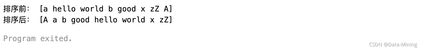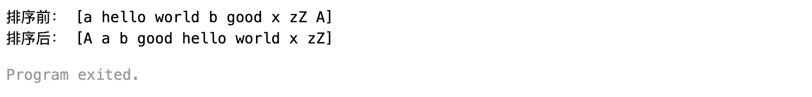 排序前: [a hello world b good x zZ A] 排序后: [A a b good hello world x zZ]