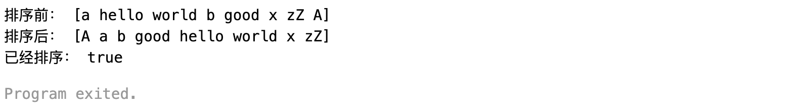 排序前: [a hello world b good x zZ A] 排序后: [A a b good hello world x zZ] 已经排序: true