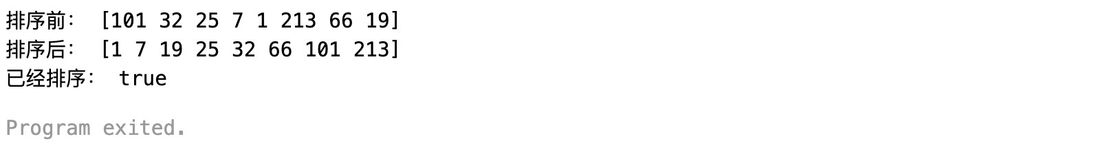 排序前: [101 32 25 7 1 213 66 19] 排序后: [1 7 19 25 32 66 101 213] 已经排序: true