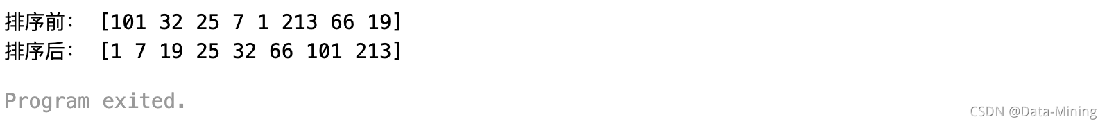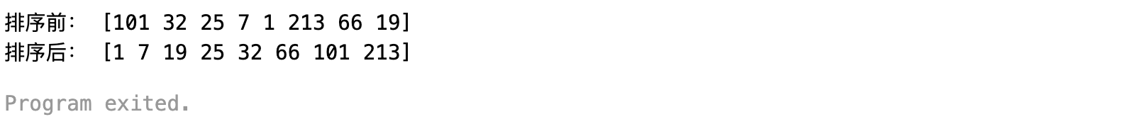 排序前: [101 32 25 7 1 213 66 19] 排序后: [1 7 19 25 32 66 101 213]