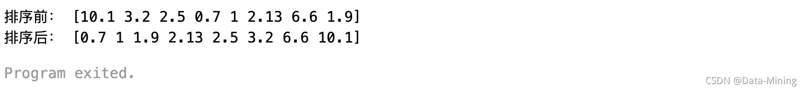 排序前: [10.1 3.2 2.5 0.7 1 2.13 6.6 1.9] 排序后: [0.7 1 1.9 2.13 2.5 3.2 6.6 10.1]