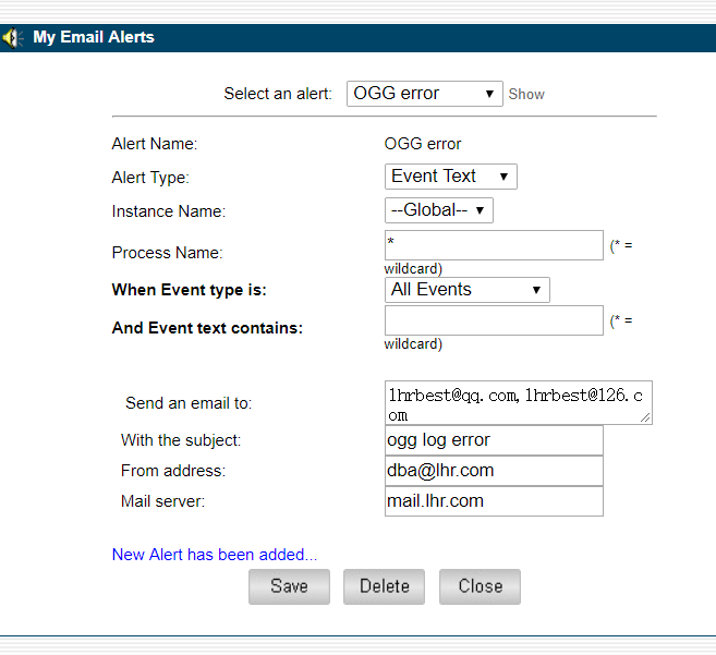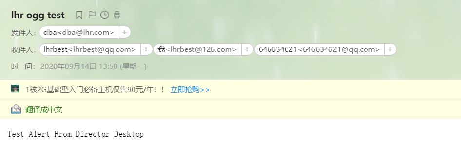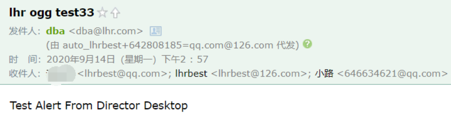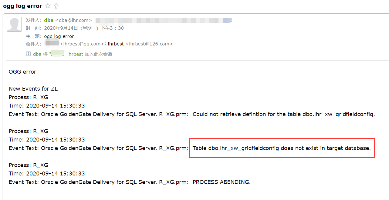 在源库新建一个表,在目标库没有这个表,那么replicat进程会报错,查看告警邮件: