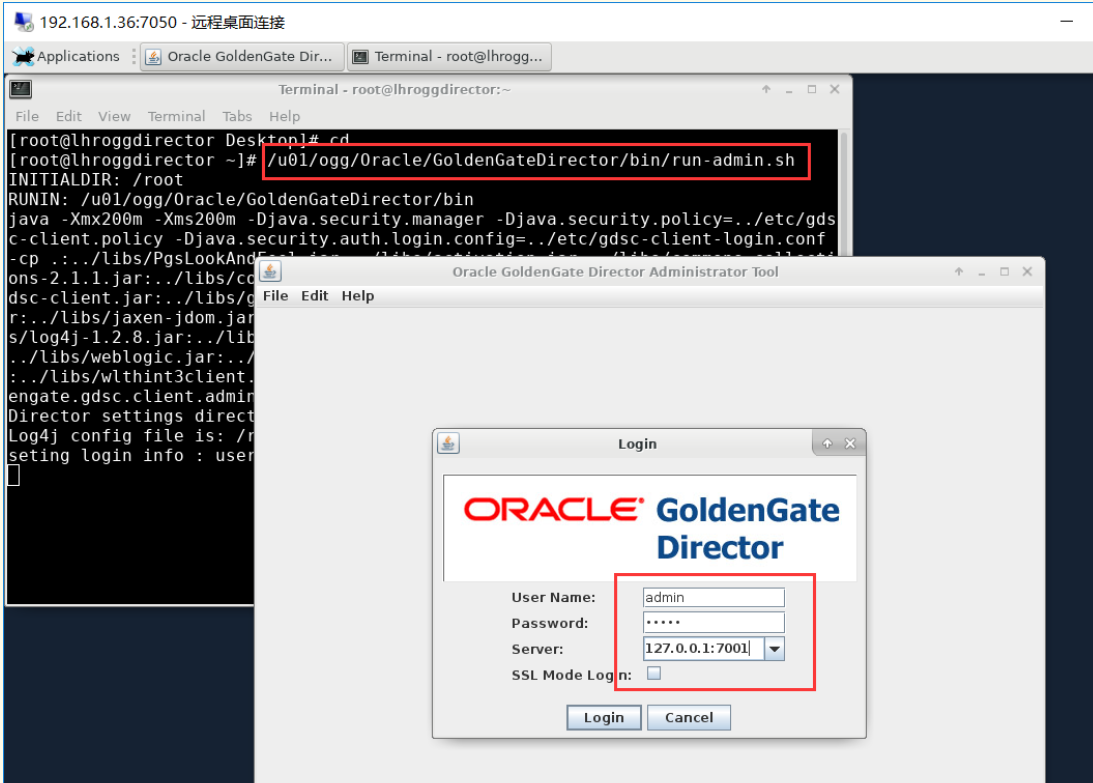 运行命令“/u01/ogg/Oracle/GoldenGateDirector/bin/run-admin.sh”调出director的客户端,输入用户名和密码都是admin,server为127.0.0.1:7001,如下图所示:
