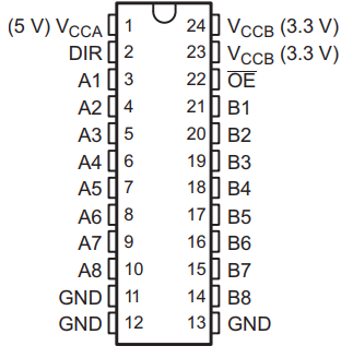 上图是74LVC4245A芯片管脚图和具体电气含义,它存在5VVCCA和3.3VVCCB,2个电源管脚,这样就可以实现5V和3.3V的转换了,同时DIR控制数据方向,这样也实现了3.3V到5V,或5V到3.3V的两个方向转换,具体转换方向的控制如下图: