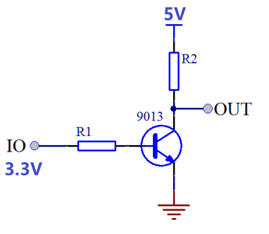 当 IO 口输出高电平 3.3V 时,三极管导通, OUT 输出低电平 0V,当 IO 口输出低电平时,三极管截止, OUT 则由于上拉电阻 R2 的作用而输出 5V 的高电平,这样就实现了低电压控制高电压的工作原理。