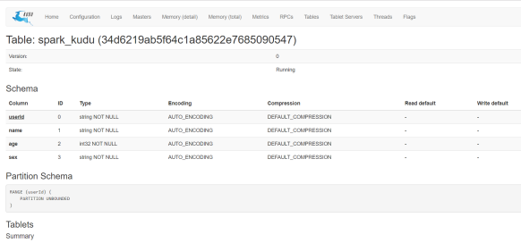 - 来查看Kudu主UI可以找到创建的表,通过单击表ID,能够看到表模式和分区信息。