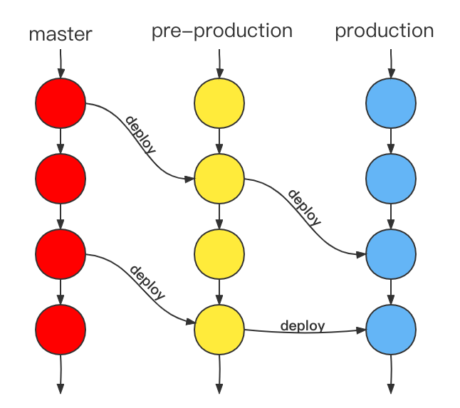 对于“持续发布”的项目,我们可以在 master 分支以外,再建立不同的环境分支。例如开发的分支是 master,预发布的分支是 pre-production,生产环境的分支是 production。