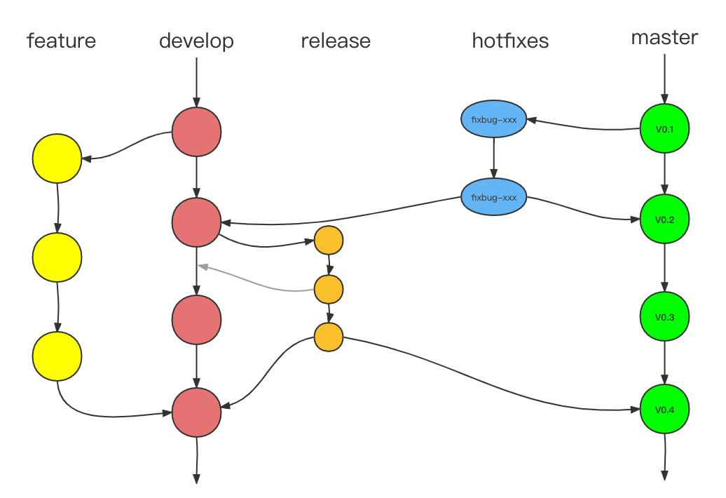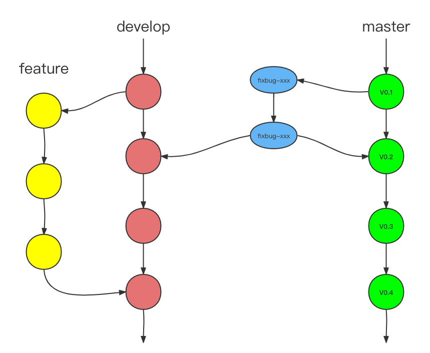这个是发版的时候拉的分支,当我们所有的功能做完之后,准备要将代码合并到 master 的时候,从 develop 上拉一个 release-xxx 分支出来,这个分支一般处理发版前的一些提交以及客户体验之后小 BUG 的修复(BUG 修复后也可以将之合并进 develop),不要在这个里边去开发功能,在预发布结束后,将该分支合并进 develop 以及 master,然后删除 release,如下图: