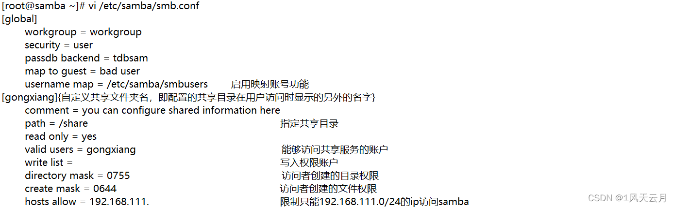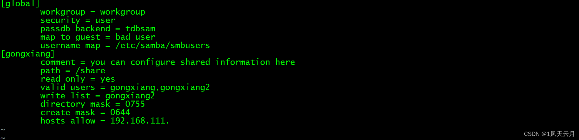 useradd -s /sbin/nologin gongxiang 创建一个不可登录系统的程序用户gongxiang pdbedit -a -u gongxiang 将gongxiang设置为共享账户同时设置共享密码 smbpasswd -a 用户名 更改共享用户密码