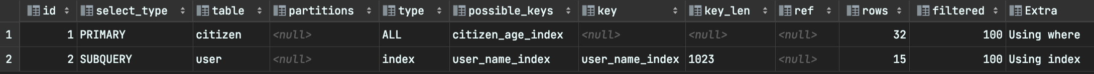 第二个执行计划select_type=SUBQUERY,即子查询,子查询针对t2表,子查询本身就是个全表查询,但对主查询而言,会使用name in筛选条件,type=index,说明使用了扫描name字段的二级索引,直接扫描name二级索引,来跟子查询的结果集做比对。