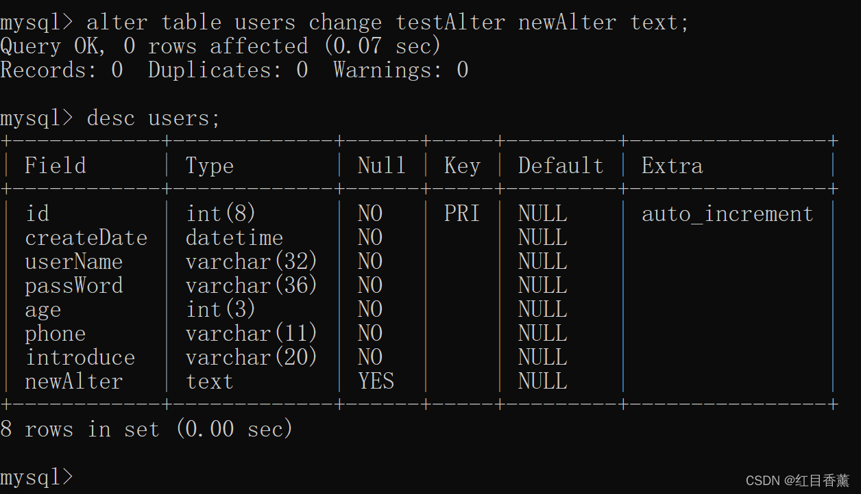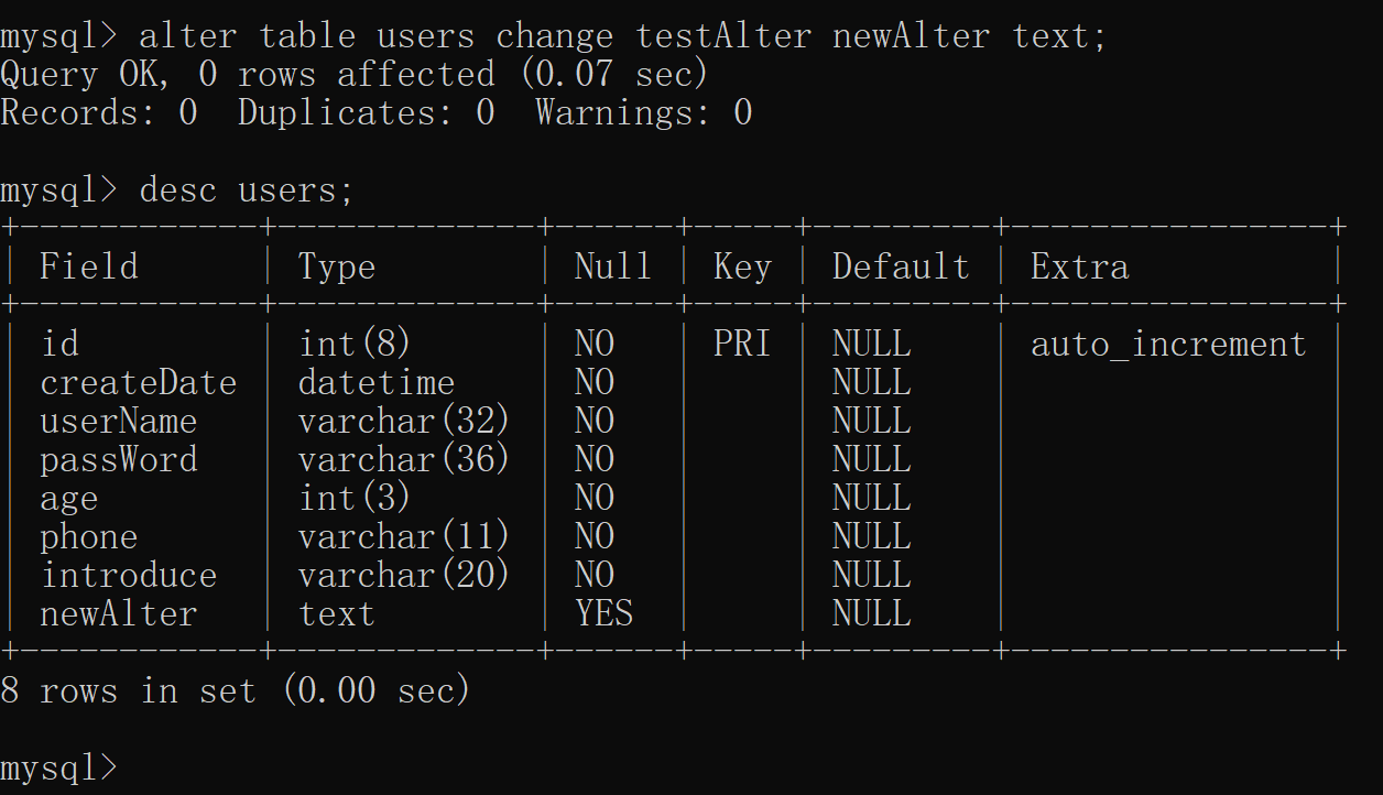 修改【testAlter】列名为【newAlter】并将数据类型修改为【text】类型