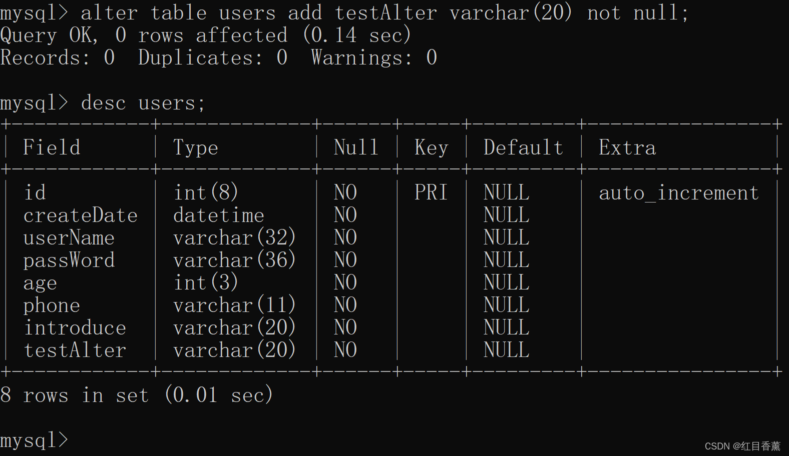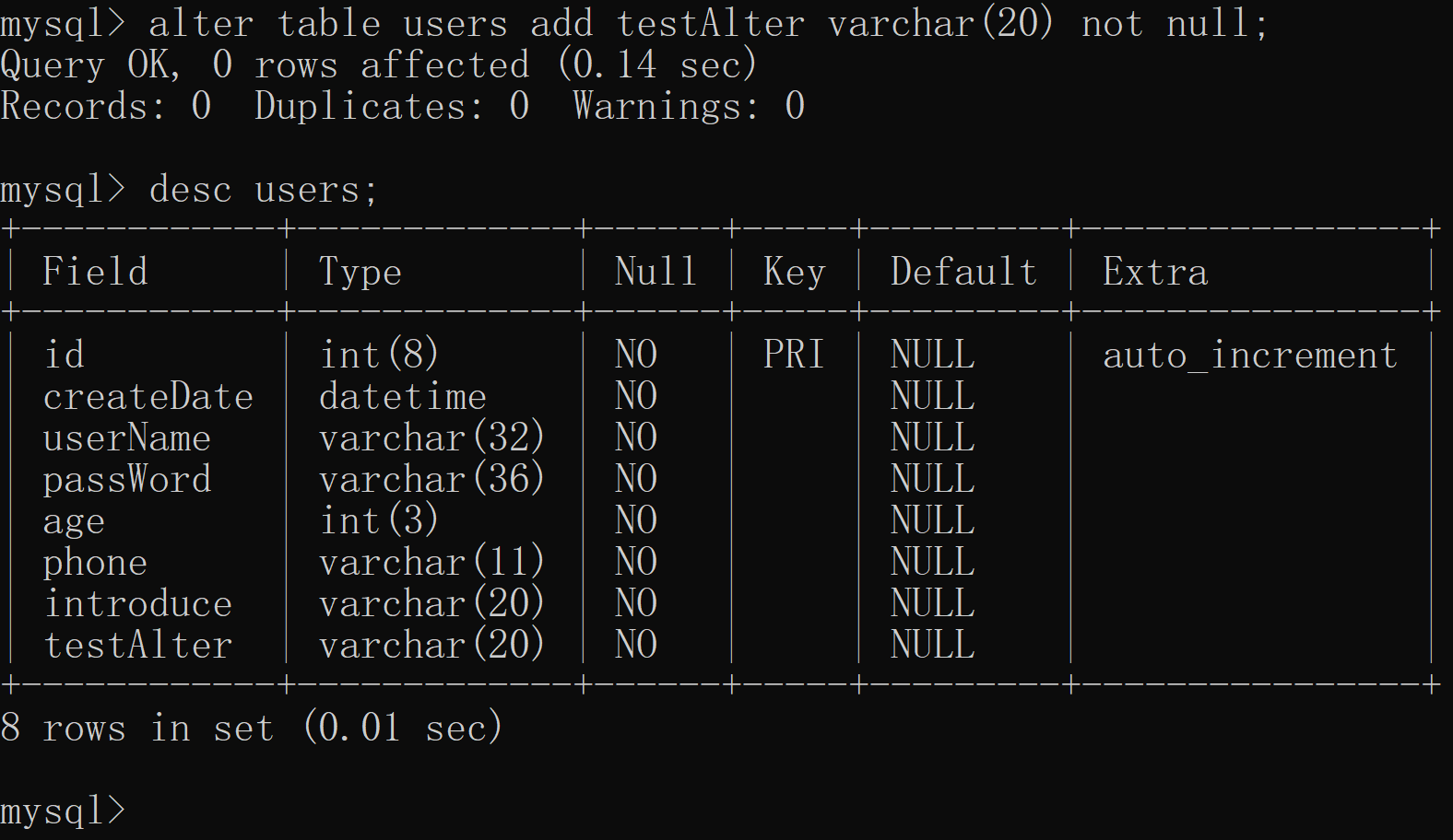 添加【testAlter】列,类型为varchar(20)且不允许为空。