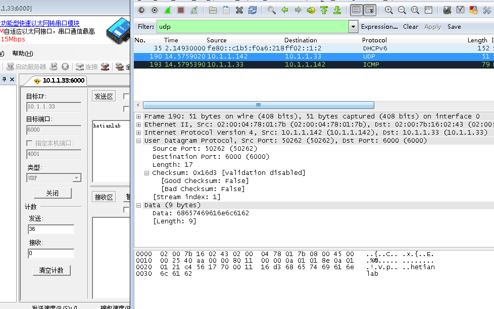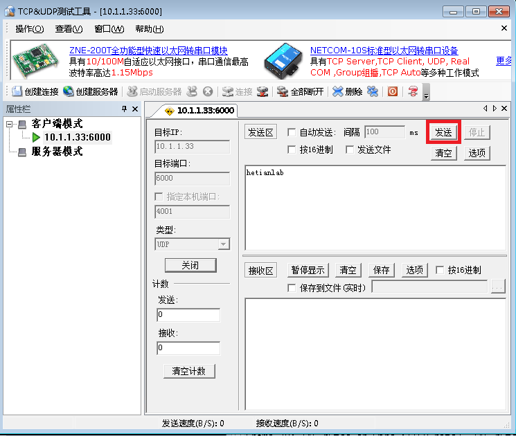 在10.1.1.142的UDP客户端,输入"hetianlab",点击下图红色标注的发送按钮,即可产生UDP数据,并发送到10.1.1.33的服务器端,如下图