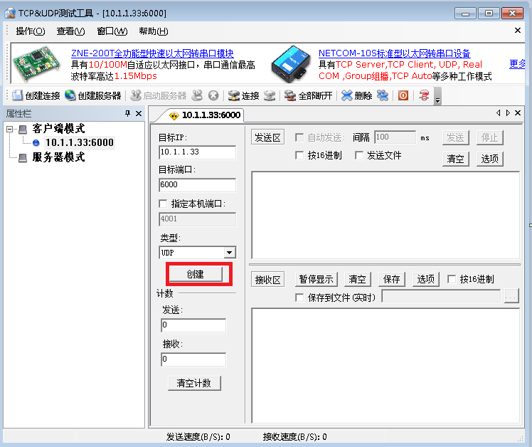 选择10.1.1.33的机器,双击桌面的" TCP&UDP测试工具",右键点击服务器模式,在下拉列表中,选择创建服务器,如下图: