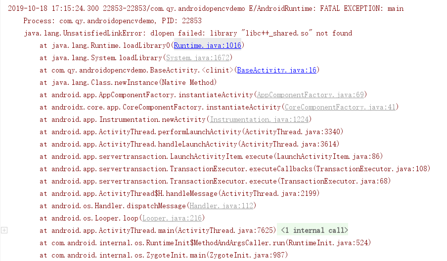 看了下日志【java.lang.UnsatisfiedLinkError: dlopen failed: library “libc++_shared.so” not found】找不到 “ libc ++ _ shared.so”库 。
