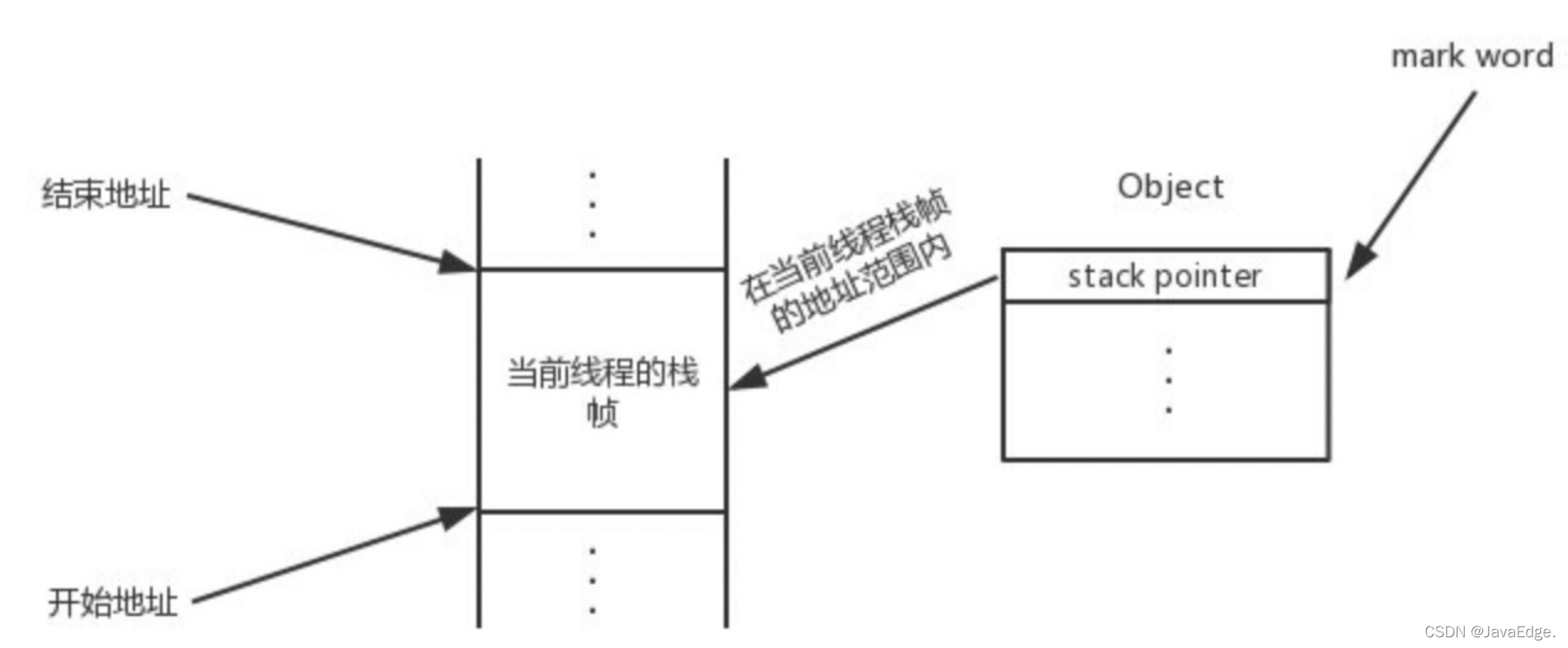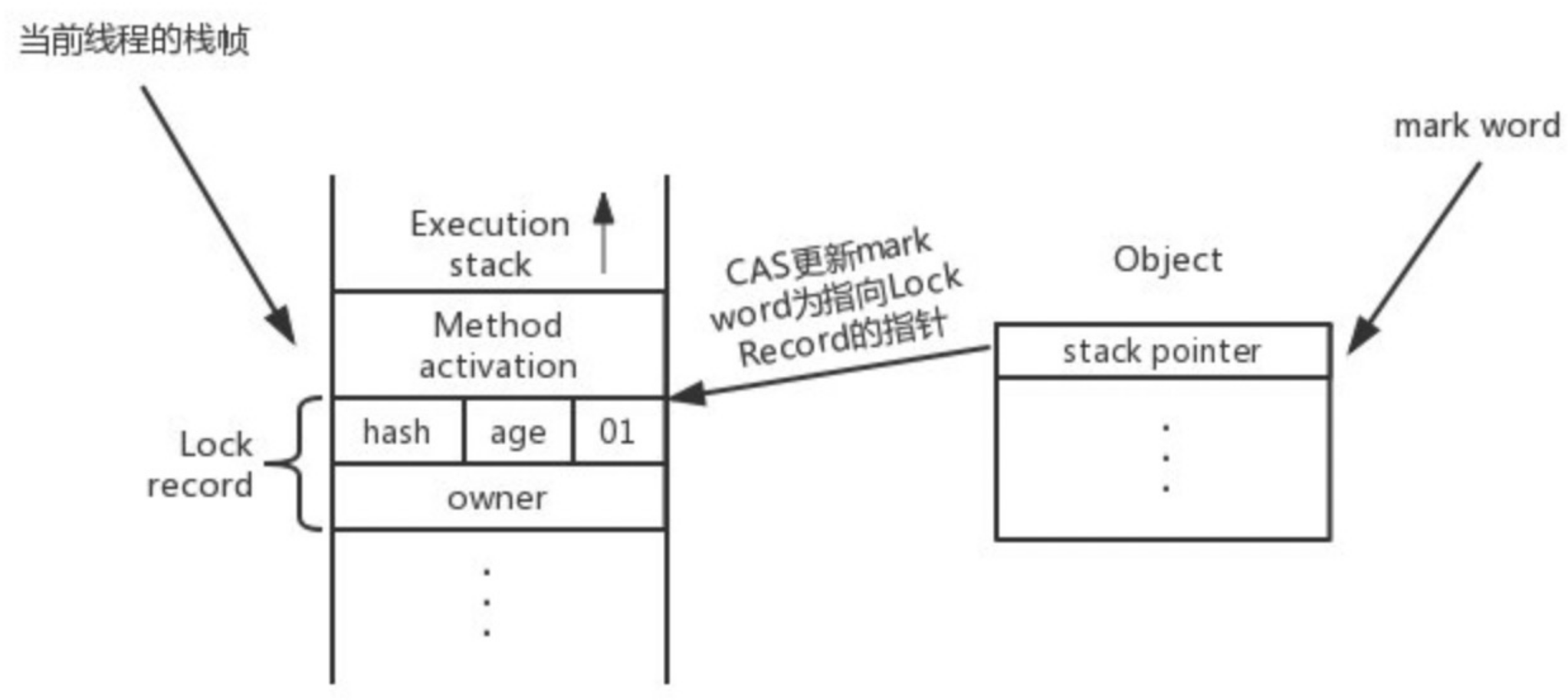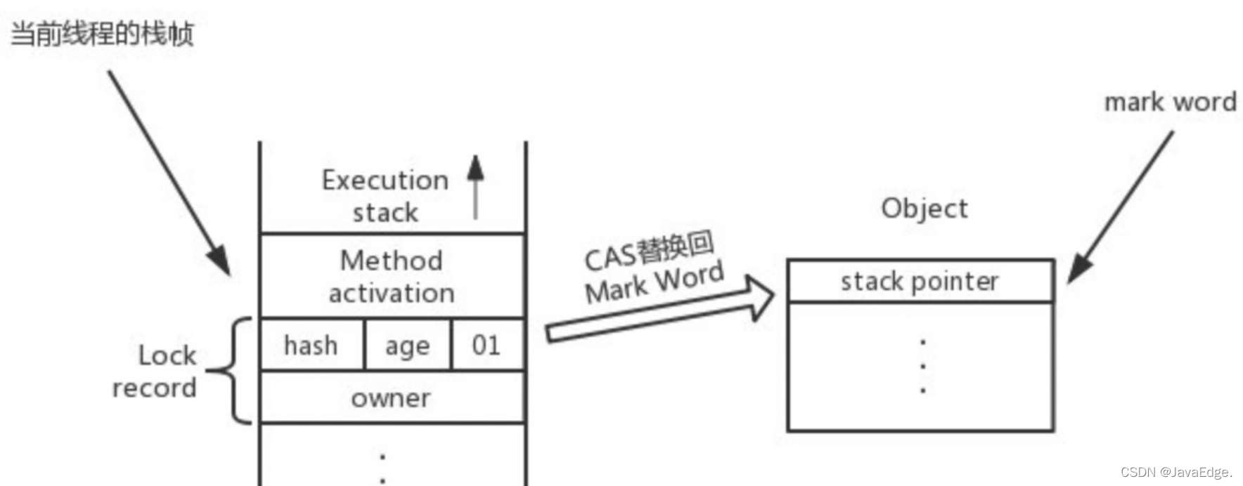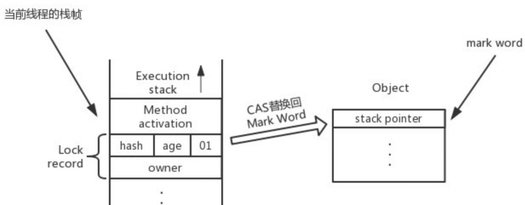 - CAS 原子替换:判断对象的 mark word 对应地址的值,看是否为第一步取到的 mark word,如果是则替换成功