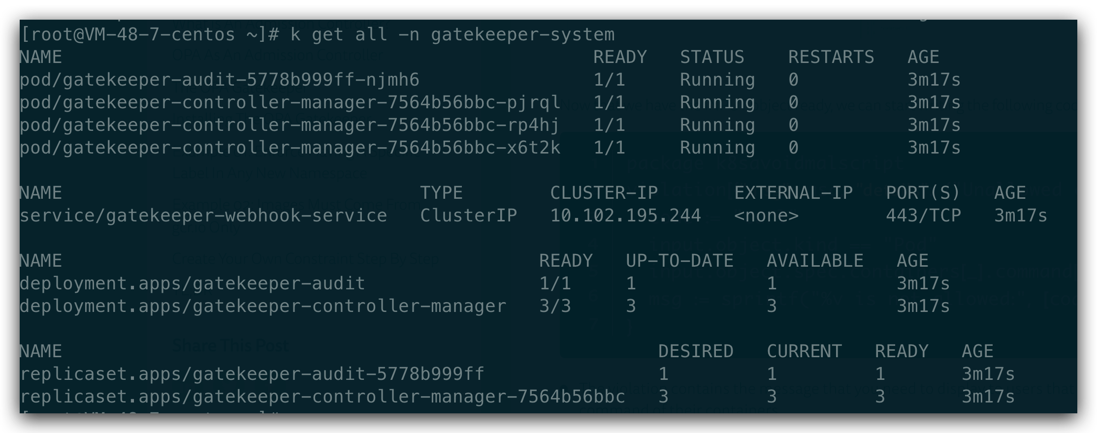 kubectl apply -f https://raw.githubusercontent.com/open-policy-agent/gatekeeper/master/deploy/gatekeeper.yaml