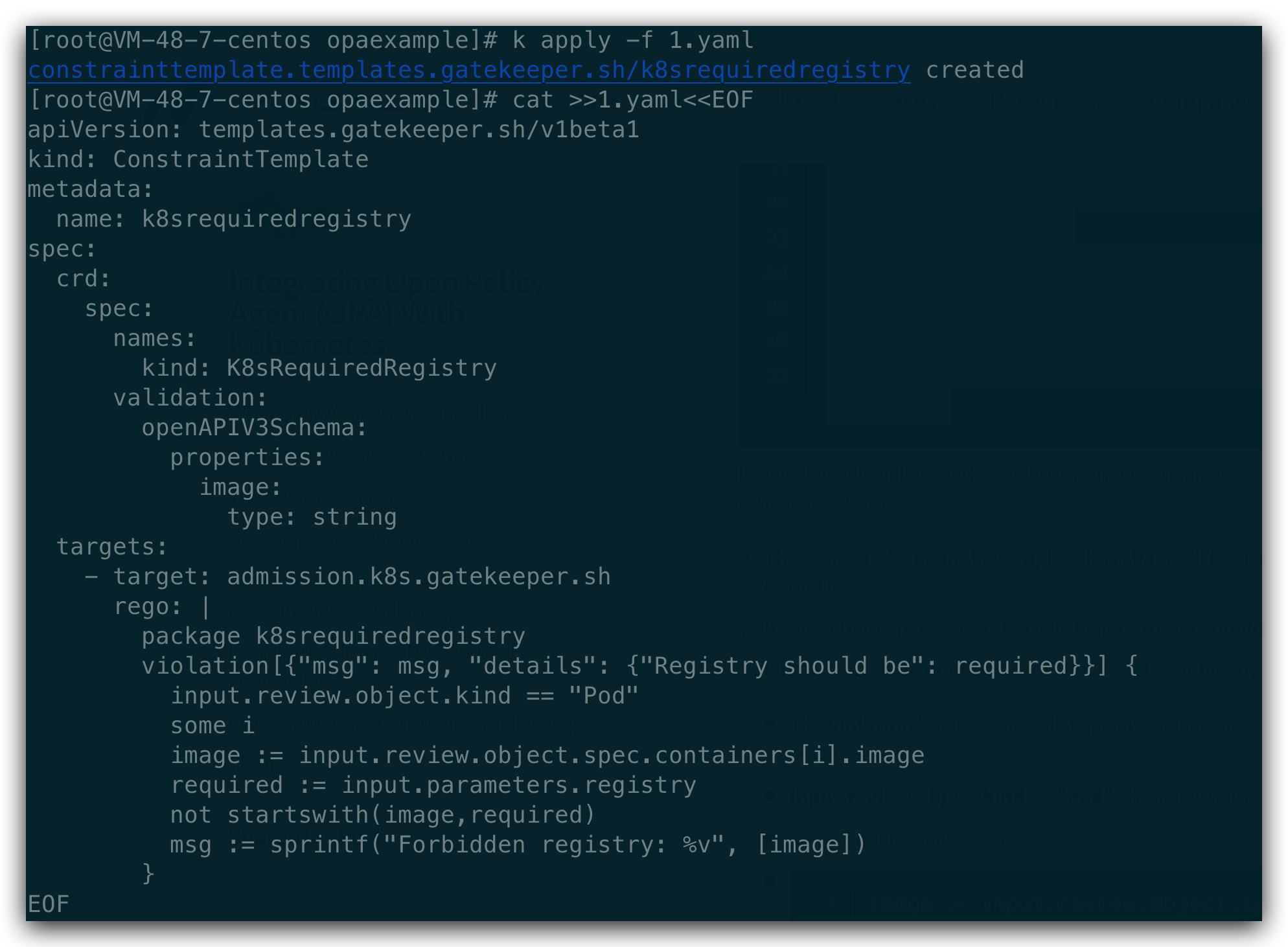 从创建约束模板开始——同样,该模板定义了您需要定义的参数以及将执行验证的实际 Rego 代码。 k8srequiredregistry_template.yaml 应如下所示: