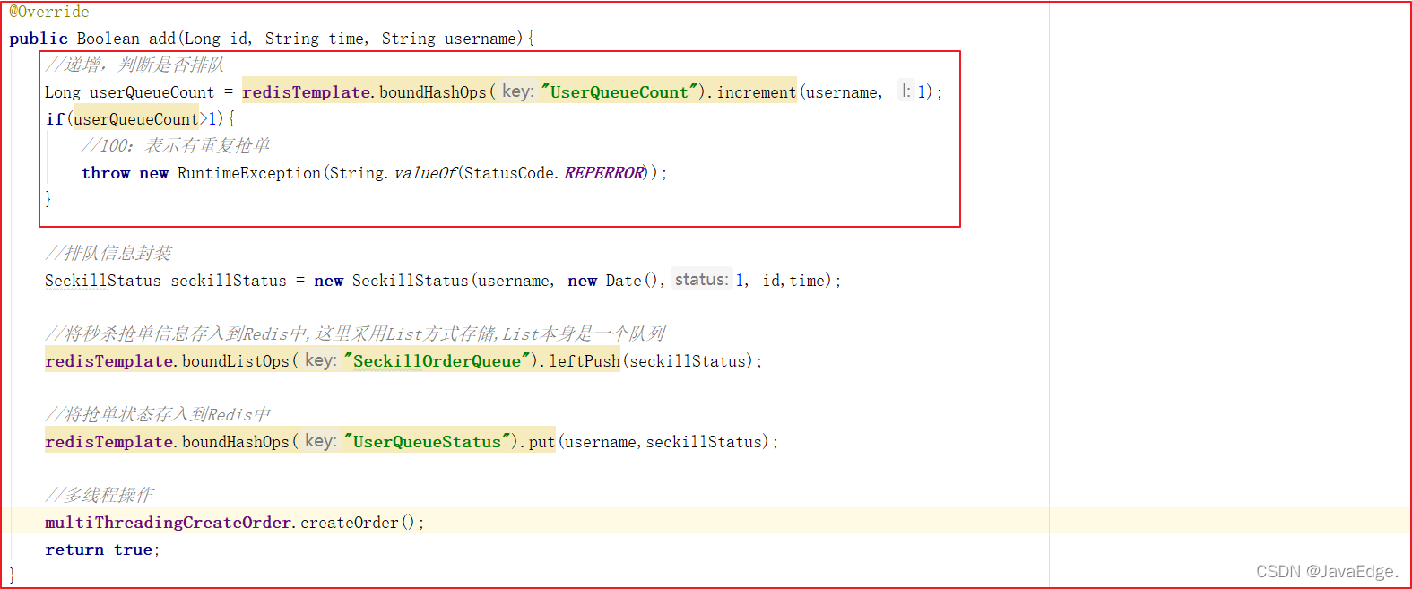修改SeckillOrderServiceImpl#add方法,新增递增值判断是否已排队: