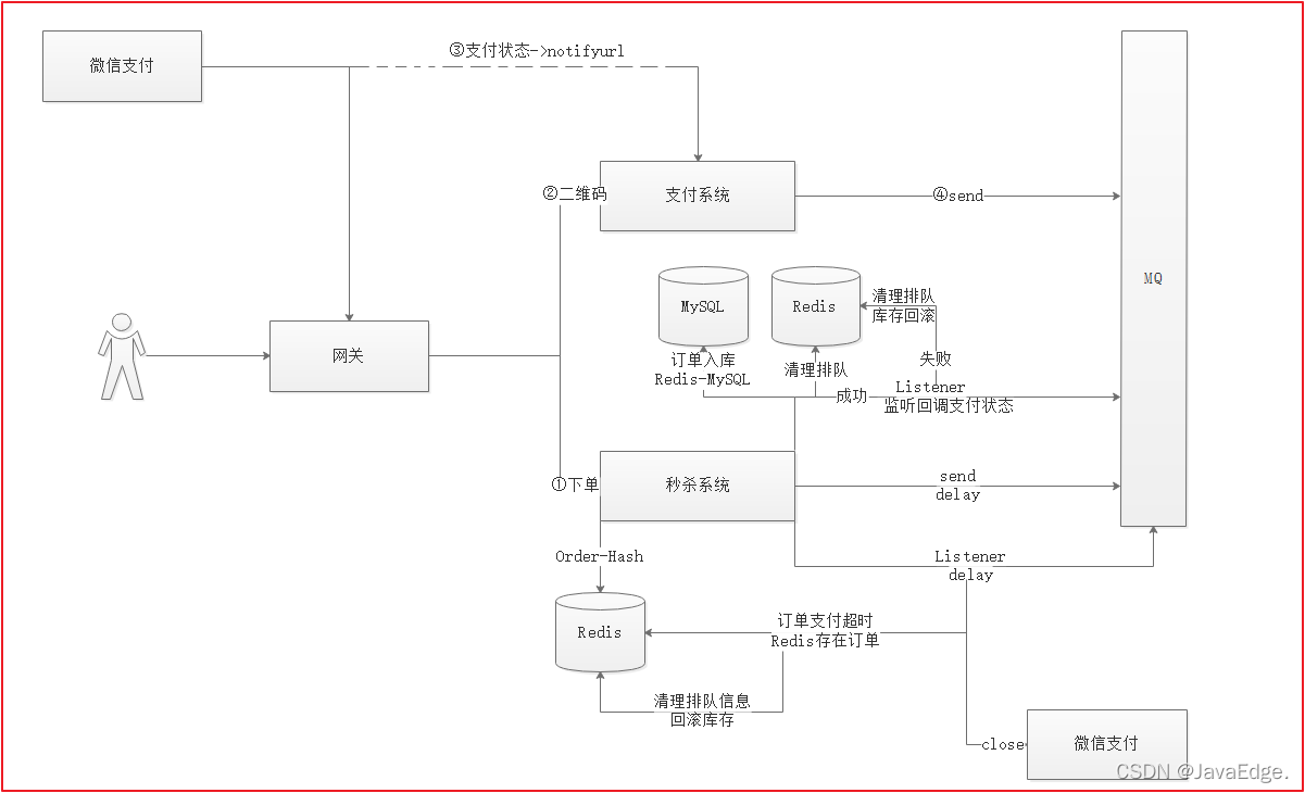 - 每次秒杀下单后调用支付系统,创建二维码。若用户支付成功,微信系统会将支付信息发给支付系统指定的回调地址,支付系统收到信息后,将信息发给MQ,第3个步骤就能监听到消息。