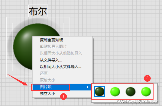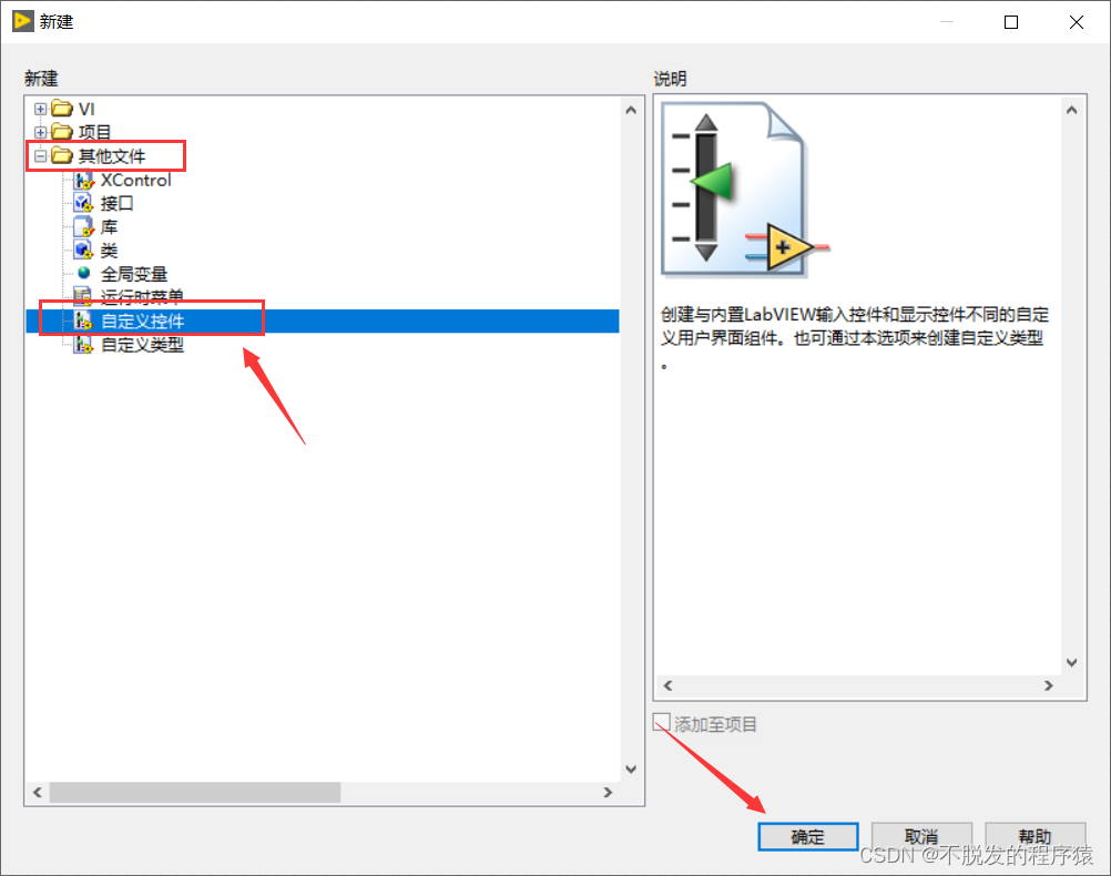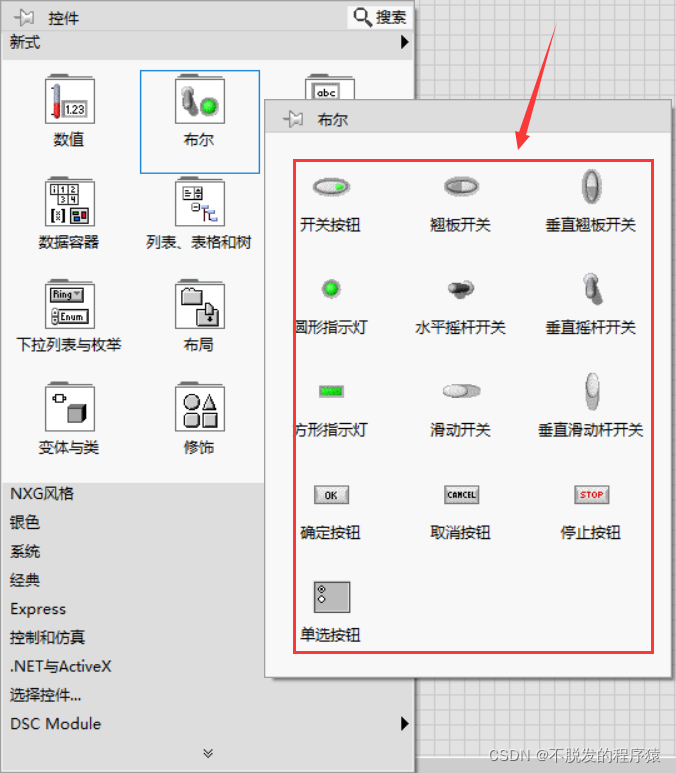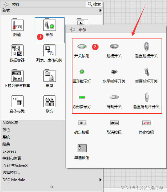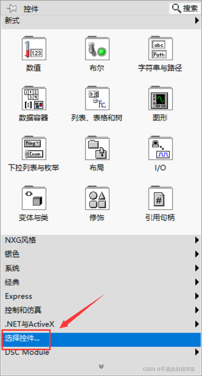 - 普通方式自定义控件:是在LabVIEW开发环境中提供的已有控件的基础上,基于控件原有的属性和方法,仅通过改变控件的外观使其成为个性化的控件,但是功能是改变不了的,哪怕外观看上去不是按钮,但它还是一个布尔控件,该类型的自定义控件保存的文件名后缀为“.ctl”;