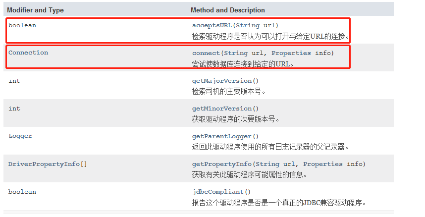 connect(String url,Properties info)方法,创建Connection对象,用来和数据库的数据操作和交互,而Connection则是真正数据库操作的开始(在此方法中,没有规定是否要进行acceptsURL()进行校验)。
