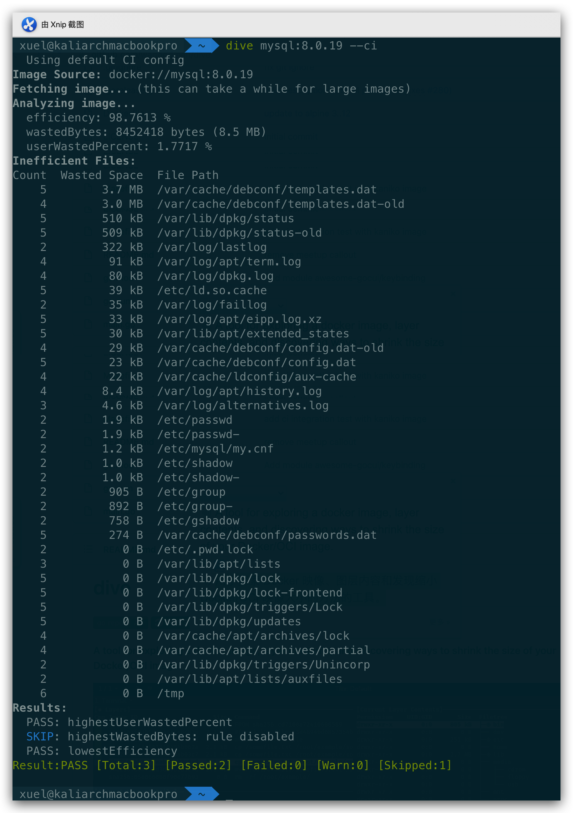 在我们CI中可以集成dive,对每次构建的镜像进行检测,及时发现镜像中的异常和优化点,针对性的优化镜像。