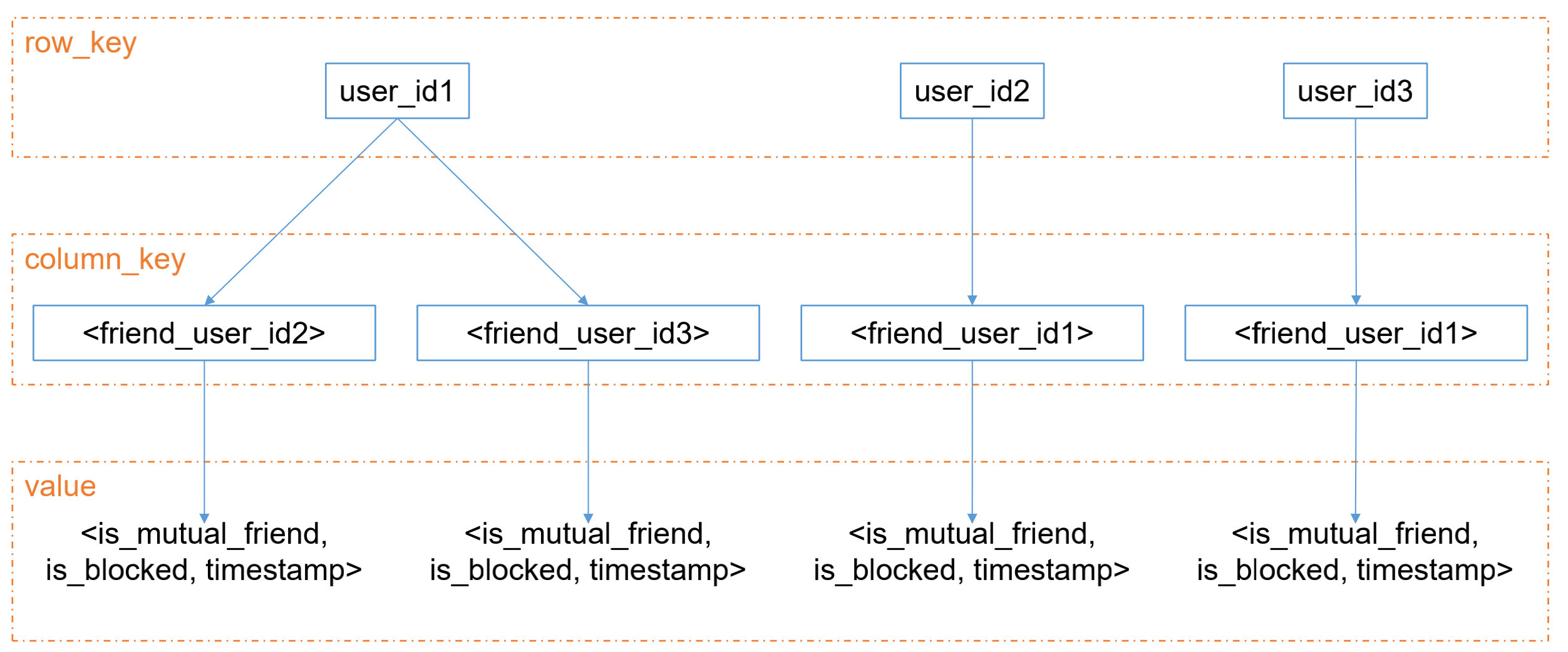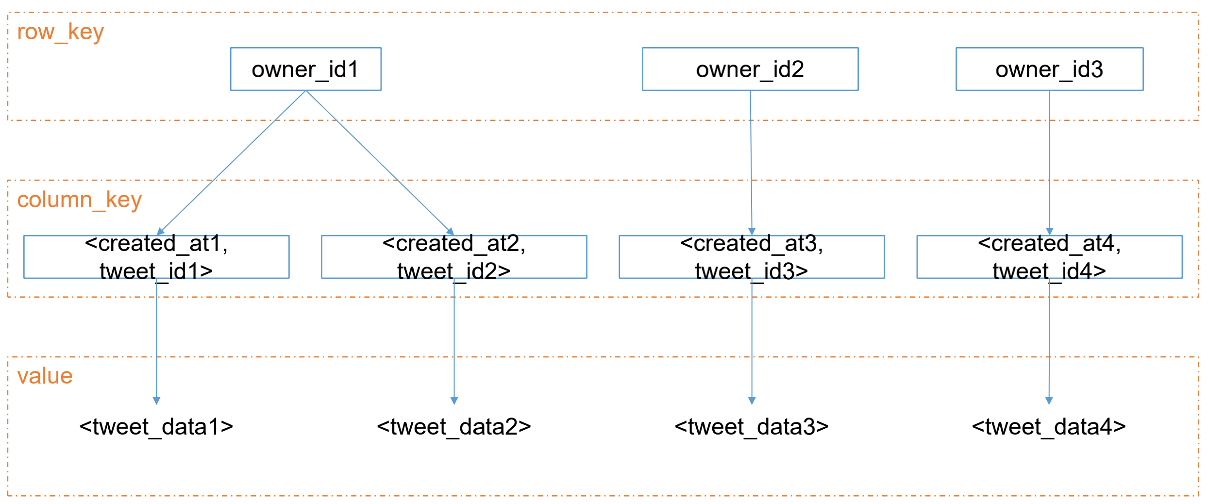 任何一条数据,都包含上面三个部分。可指定 column_key 按何排序。