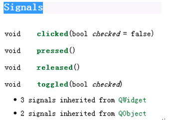 那么系统自带的信号和槽通常如何查找呢,这个就需要利用帮助文档了,在帮助文档中比如我们上面的按钮的点击信号,在帮助文档中输入QPushButton,首先我们可以在Contents中寻找关键字 signals,信号的意思,但是我们发现并没有找到,这时候我们应该想到也许这个信号的被父类继承下来的,因此我们去他的父类QAbstractButton中就可以找到该关键字,点击signals索引到系统自带的信号有如下几个