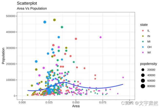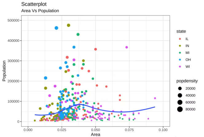 数据分析最常用的图无疑是散点图。每当你想了解两个变量之间关系的性质时,第一选择总是散点图。它可以使用 geom_point() 绘制。此外,默认情况下绘制平滑线的 geom_smooth 可以通过设置 method='lm' 调整以绘制最佳拟合线。