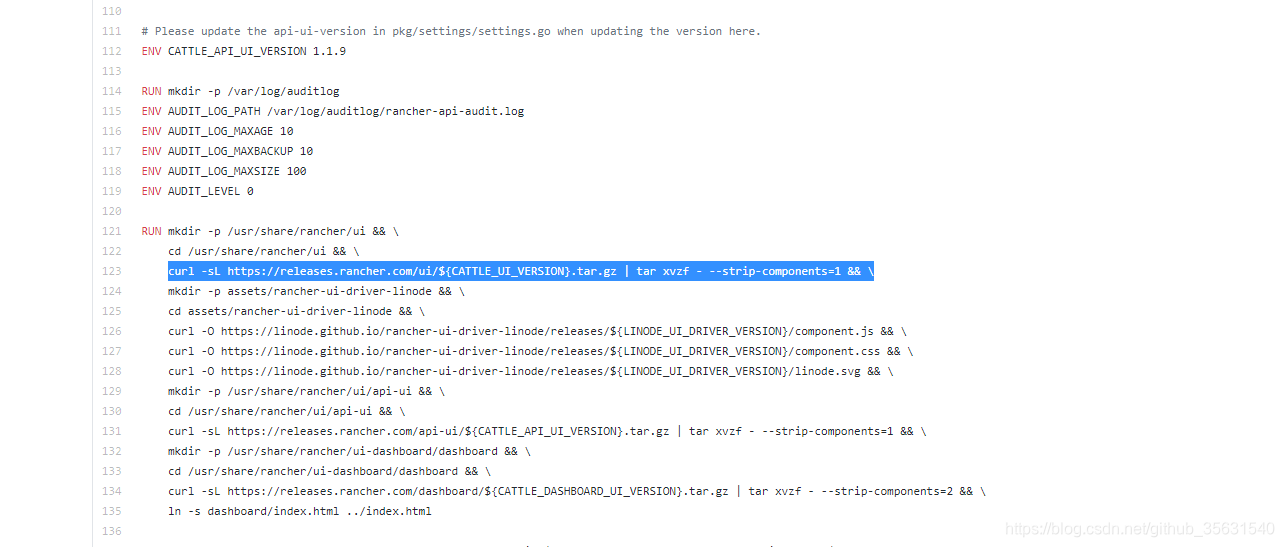 将 https://releases.rancher.com/ui/${CATTLE_UI_VERSION}.tar.gz 修改为 http://1.2.3.4/v2.4.5.tar.gz