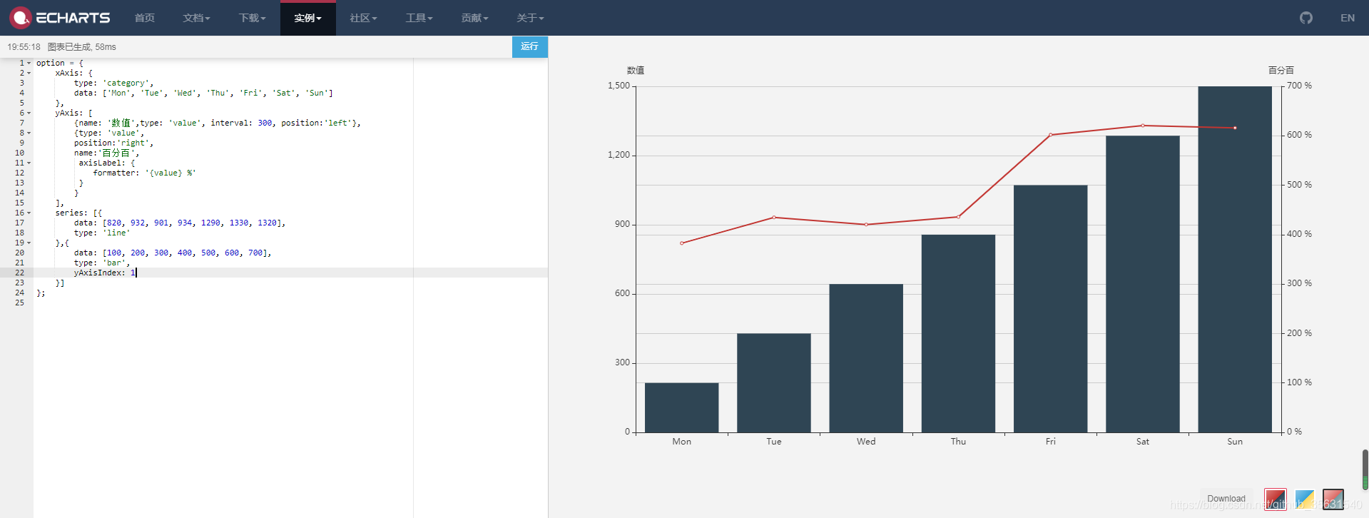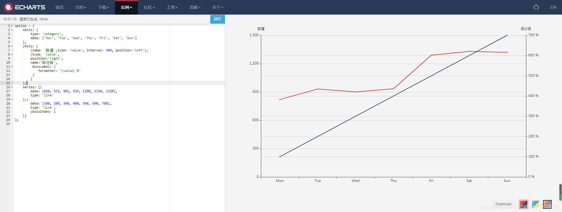 echart 双折线 双Y轴, 折线,柱形 双Y轴图
