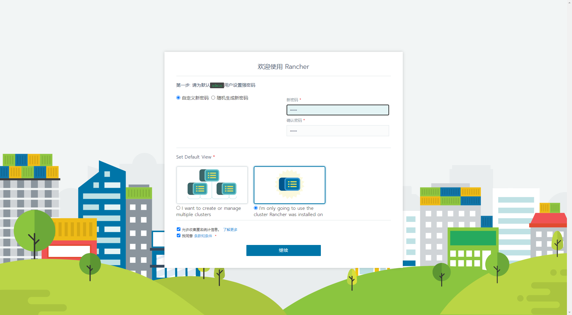 第一次需要设置密码 并且选择默认的视图,这里选择视图要选择第二个才能直接进入Rancher的Dashboard I‘m only goding to use the 。。。。。