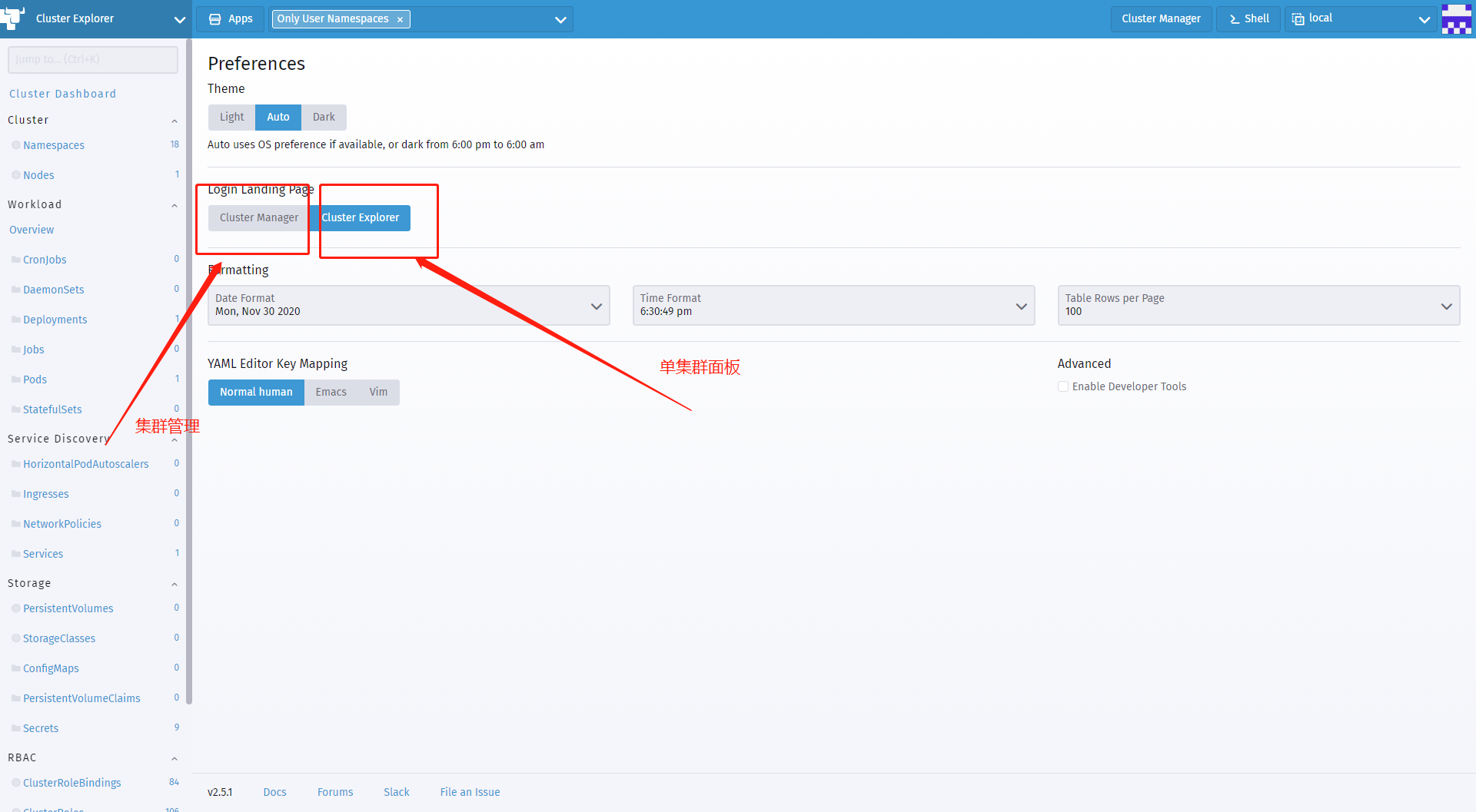 可以看到整个系统还没有做国际化,没有切换语言的功能。 点击右上角的Cluster Manger 可以到达旧版的UI,进行多集群管理。也可以在用户设置那里进行设置,登录后前往那个页面