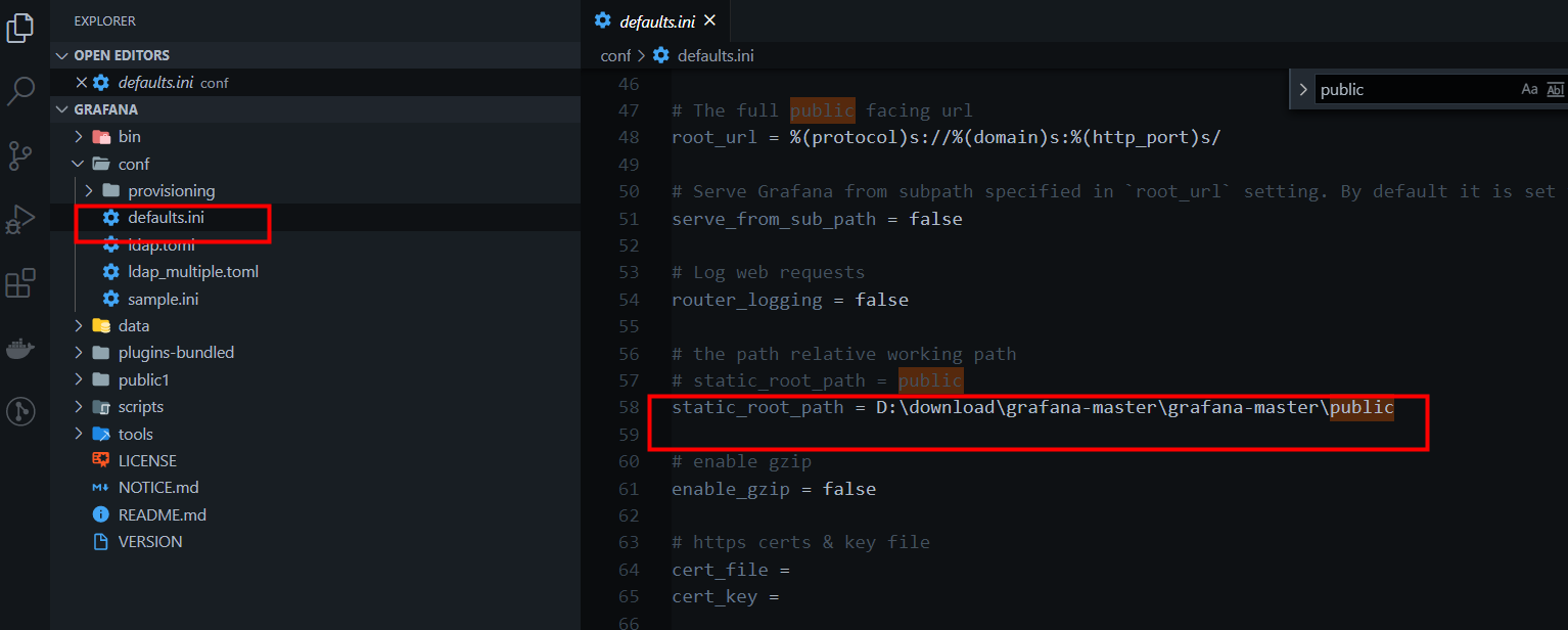 static_root_path属性指向 grafana 目录下的 public 此处的public 是前端经过编译后的静态文件