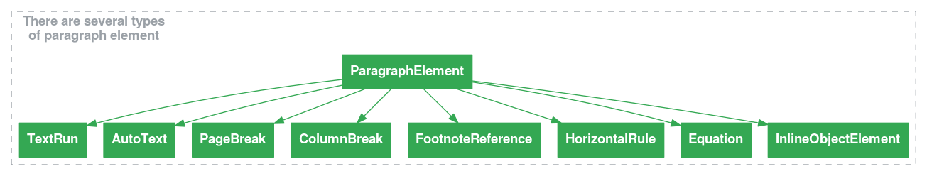 段落包含一个名为元素的一种特殊类型的 ParagraphElement中 的作品就像一个StructuralElement:它是由它自己的一套的内容类型的个性化,如图所示,如下图: