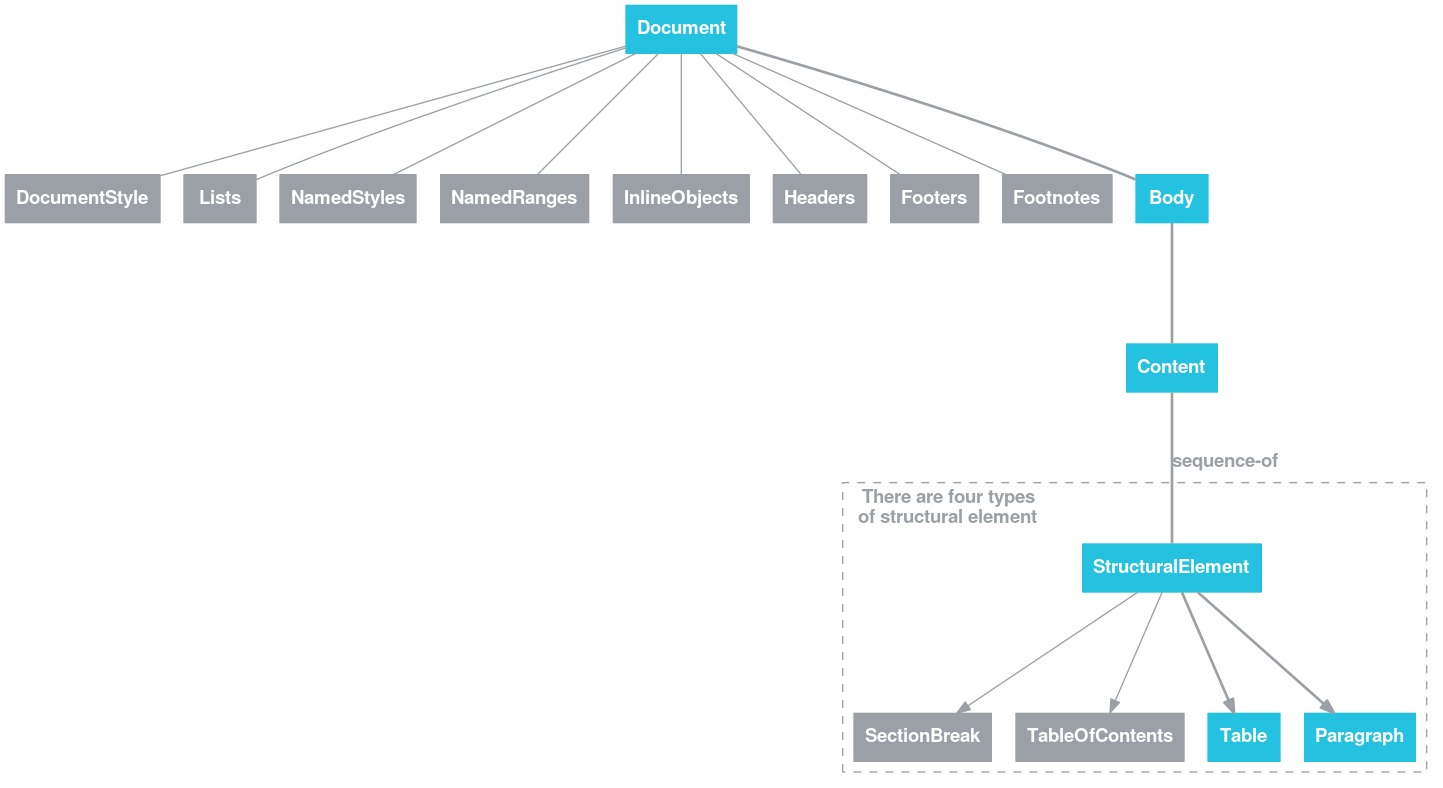 document: { body: ... , documentStyle: ... , lists: ... , documentId: ... , namedStyles: ... , ...