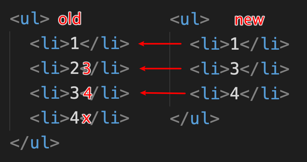 例如假设你有包含十个项目的列表,你仅仅更改了列表中的第一项,大多数 JavaScript 框架会重建整个列表,这比必要的工作要多十倍。