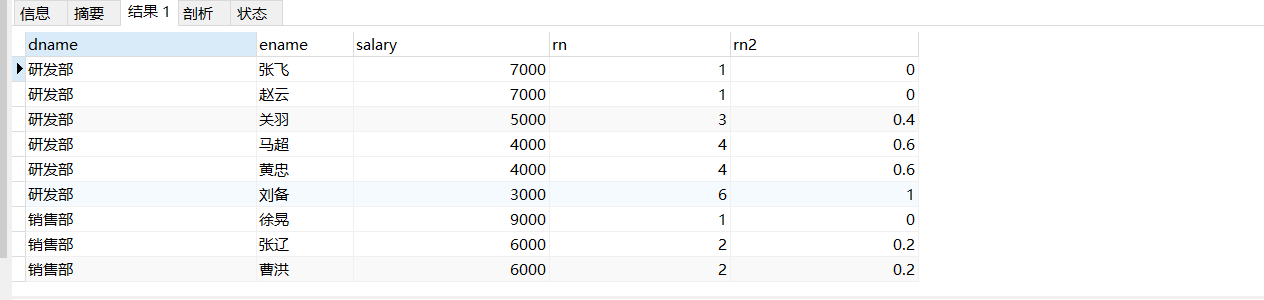 select dname, ename, salary, cume_dist() over(order by salary) as rn1, -- 没有partition语句 所有的数据位...